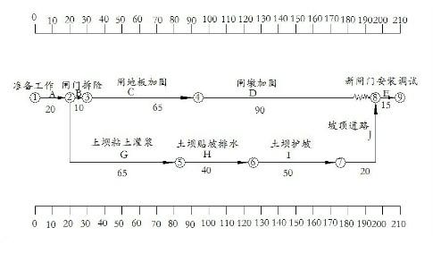 某水庫除險(xiǎn)加固工程內(nèi)容有:(1)溢洪道的閘墩與底板加固,閘門更換;(2土壩粘土灌漿、貼坡排水、護(hù)坡和壩頂?shù)缆分亟āJ┕ろ?xiàng)目根據(jù)合同工期、設(shè)備、人員、場地等具體情況編制了施工總進(jìn)度計(jì)劃,形成的時(shí)標(biāo)網(wǎng)絡(luò)圖如下(單位:天)