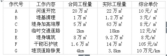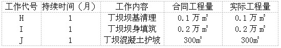 工程開工后在施工范圍內(nèi)新增一丁壩。丁壩施工工作面獨(dú)立,箕壩基清理、壩身填筑、混凝土護(hù)坡等三項(xiàng)工作依次施工,在第5個(gè)月初開始施工,堤頂?shù)缆沸迯?fù)開工前結(jié)束:丁壩壩基清理、壩身填筑工作的內(nèi)容和施工方法與堤防施工相同;雙方約定,混凝土護(hù)坡單價(jià)為300元/m3,丁壩工程量不參與工程量變更。各項(xiàng)工作的工程量、持續(xù)時(shí)間見表2。