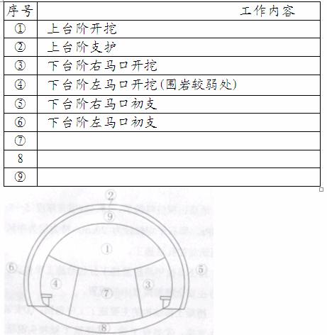 施工單位針對該項日編制了專項施工方案,其中包括工程概況、編制依據、勞動力計劃等內容。擬采取二臺階開挖方法施工,施工順序如圖3所示,并按①-⑨的順序作業。針對該隧道施工過程中有可能出現突水安全事故的特點,編制了應急預案。