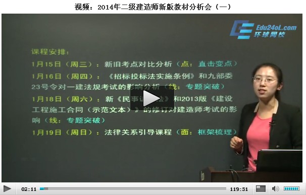 2014年二建新教材分析會 N0.1 1月15日(晚上19:00--21:00) 2014年二建新教材分析會 N0.2 1月16日(晚上19:00--21:00) 2014年二建新教材分析會 N0.3 1月18日(下午15:00--17:00) 2014年二建新教材分析會 N0.4 1月19日(下午15:00--17:00)