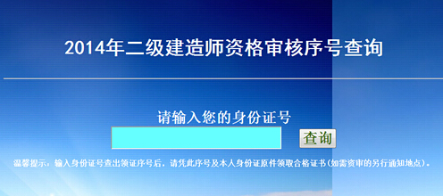 三、選擇“2014年二級建造師資格審核序號查詢”,輸入身份證號碼,獲取領證序號后憑序號領取合格證書
