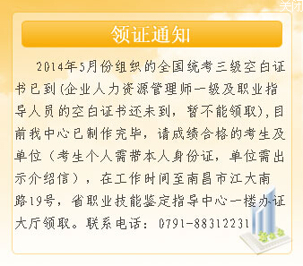 江西省2014年5月人力資源管理師證書領取通知(三級)
