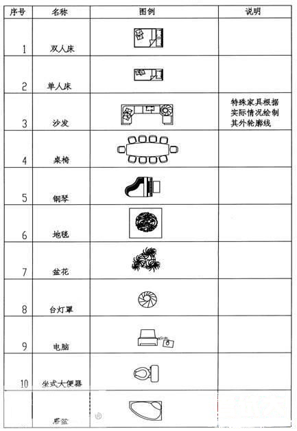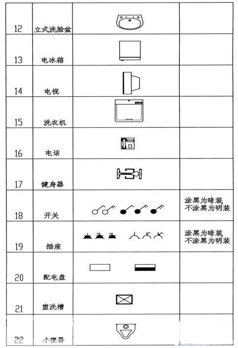 3.裝飾施工圖的圖例。由于建筑裝飾發展的速度相當快,許多圖例都沒有統一的標準,大多是在流行中互相沿用,有些還不具有普遍意義,有時須加文字注釋。目前常用的裝飾施工圖圖例見表1-2-2。