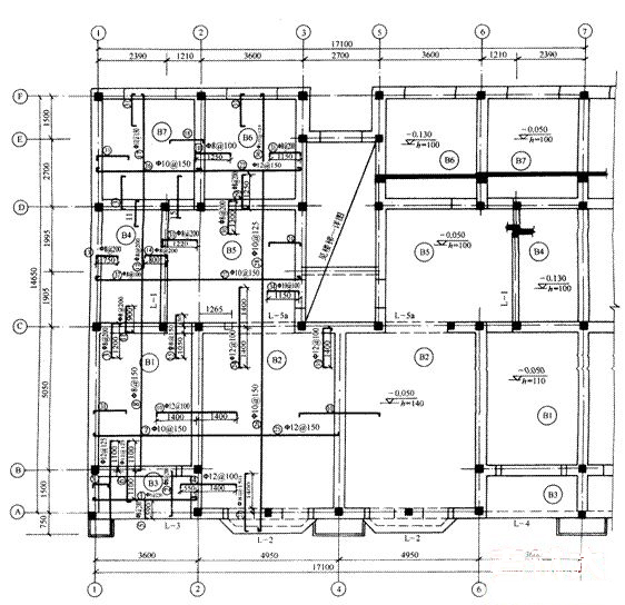 圖1-2-8是某住宅單元地下室頂板結構平面圖。本住宅有兩個單元,因兩個單元結構形式一樣,配筋相同,所以只畫一個單元。繪圖比例l:50,圖上被剖切到的構造柱被涂黑。板下梁在相應位置上注出(如L-l、L-2等),樓板按相同配筋、尺寸、板厚等條件分成7種板,用圓圈加編號的形式標出,樓板配筋用粗線按規定畫法畫出,一種板只畫一塊。因每塊板的板厚、標高不盡相同,所以需要一一標出,并在高低變化處畫出了重合斷面圖。樓梯間因習慣上需另畫詳圖,這里僅畫一條對角線并標注說明。樓梯結構圖的詳解單獨說明。
