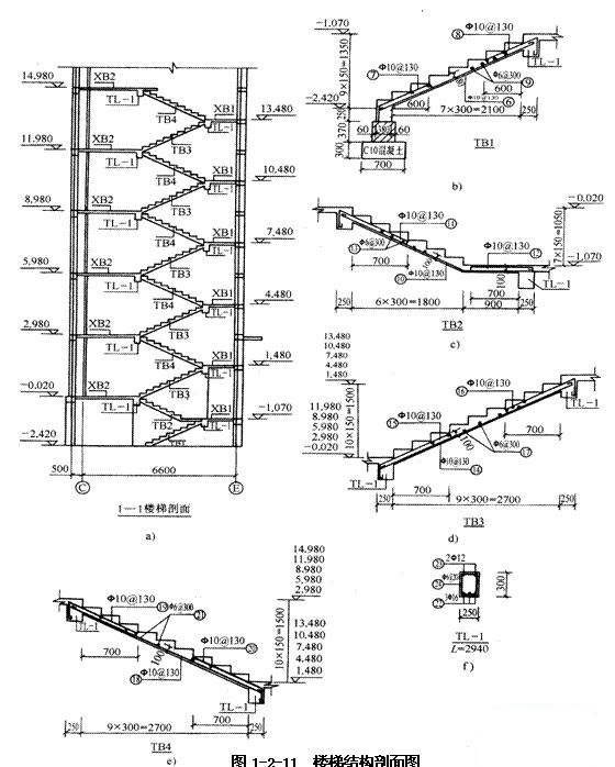 圖1-2-11a所示是l―l樓梯剖面,主要表示了TB、TL、XB在豎向的位置、標(biāo)高,結(jié)構(gòu)情況。由圖中看出TBl、TB2各一塊,TB3、TB4各5塊。TL1 12根,各構(gòu)件在空間的位置一目了然。圖1-2-11b、圖1-2-11c、圖1-2-11d、圖1-2-11e分別為TBl、TB2、TB3、TB4的剖畫圖;圖1-2-11f為平臺(tái)梁TL―l的剖面圖。從圖1-2-11b可以看出,從地下室-2.420m到-1.070m共有9步,每步高150mm;踏步板厚80mm并與平臺(tái)梁TL-l直接相連,梯板中的配筋⑥φ10@130為縱向受力筋,布置在板底;⑨號(hào)分布筋橫向布在受力筋上面,⑦⑧號(hào)為構(gòu)造筋,布置在板兩端的上方,兩端深入平臺(tái)梁內(nèi)。TB2、TB3、TB4的構(gòu)造形式與TBl基本相同,不同之處是踏步板厚改為100mm,TB2為折板。圖1-2-11f為平臺(tái)梁TL―l斷面圖,梁寬250mm,梁高300mm,長2940mm,左右兩側(cè)分別與踏步板、平臺(tái)梁相連,它的標(biāo)高見1―1樓梯剖面圖,梁中受力筋22為3φ16,架力筋23為2φ12,箍筋φ6@200。