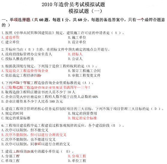 2010年造價(jià)員考試考前沖刺模擬試卷一(1)