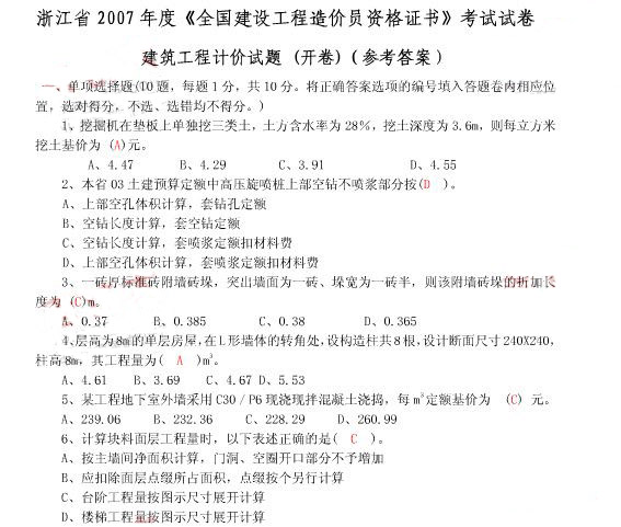 2007年浙江造價(jià)員建筑工程真題及答案(1)