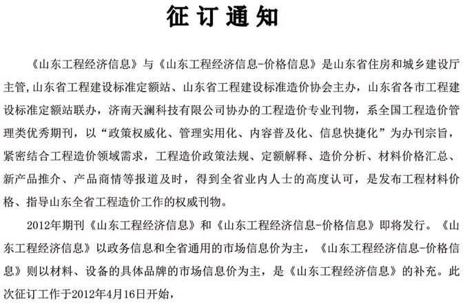 2012年度山東省工程造價(jià)信息征訂通知