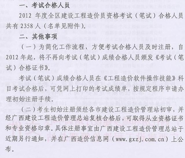 廣西2012全區(qū)建設(shè)工程造價員考試合格名單