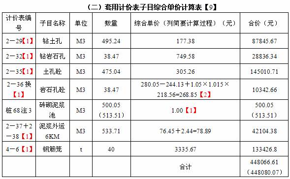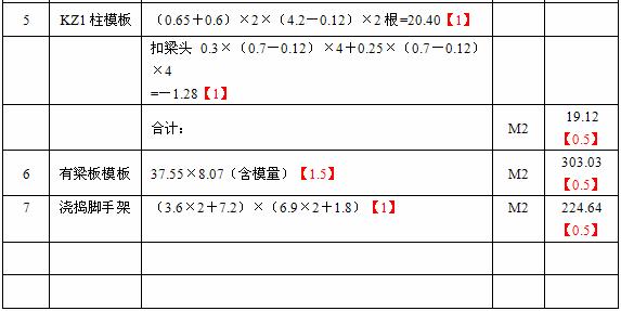 評分說明:定額號正確,每項得1分,應標未標注換時僅得0.5分;定額名稱正確,每項得0.5分;計量單位均正確得0.5分,否則不得分;定額數量均正確得0.5分,否則不得分;換算過程按題中得分點,共8分;定額綜合單價正確每項0.5分;清單綜合單價正確得0.5分,合價正確得0.5分。