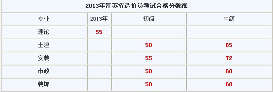 根據江蘇工程造價信息網于2014年1月26日 9:07:32發布的《2013年江蘇省建設工程造價員資格考試工作結束》,得知2013年江蘇造價員考試合格標準公布,具體為: