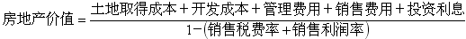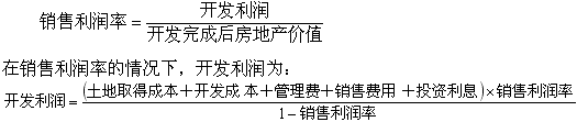 4)計算基數 = 土地取得成本 + 開發成本 + 管理費用 + 銷售費用 + 投資利息 +銷售稅費+開發利潤 = 開發完成后的房地產價值(售價), 相應的利潤率稱為銷售利潤率,即: