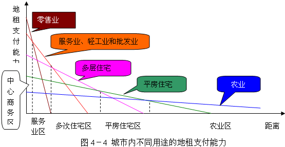 對圖4-4的理解如下:由于各種用途對交通都有要求,而且不同用途對交通的敏感程度不同,所以在完全競爭的市場條件下,每種用途的經濟地租曲線均是遞減的,并且梯度不同。一般地說,由于零售業對交通最為敏感,有所謂“一步三市”,其經濟地租曲線的梯度最大,在市中心所能產生的經濟地租為各種用途之最。專業服務業(如律師、會計師、估價師等)、輕工業和批發業因對交通沒有零售業那么敏感,其經濟地租曲線的梯度較零售業小。接下來的是居住用途,因為它對交通的敏感程度不如前者,所以經濟地租曲線的梯度要更小一些。在居住用途中,由于高密度多層住宅的土地利用率較高,其經濟地租曲線的梯度較低密度平房住宅大。農業由于在市中心和在較偏遠的市郊所產生的經濟地租差異較小,所以經濟地租曲線較平緩,梯度是各類經濟活動中最小的。