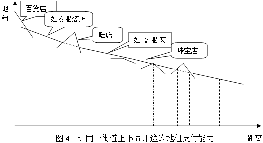 在同一街道,不同位置與地租及土地用途的關系如圖 4-5 所示。