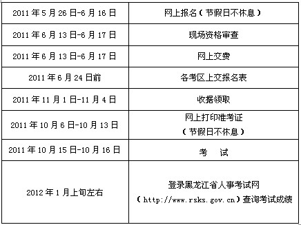 報(bào)名時(shí)間:2011年5月26日-6月16日(節(jié)假日可報(bào)名)。報(bào)名考生登錄黑龍江省人事考試網(wǎng)(http://www.rsks.gov.cn)的“網(wǎng)上報(bào)名”欄目,按照考試網(wǎng)上報(bào)名系統(tǒng)規(guī)定的程序和要求在網(wǎng)上填寫(xiě)個(gè)人信息,上傳照片,從網(wǎng)上直接打印報(bào)名表(報(bào)名表用A4紙打印,供現(xiàn)場(chǎng)資格審查時(shí)使用)。