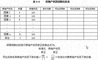 間接比較修正與直接比較修正相似,所不同的是設想一個標準的房地產狀況,以此標準的房地產狀況為基準,將估價對象及可比實例的房地產狀況與它逐項比較打分,然后將所得的分數轉化為修正價格的比率,參見表4―4。