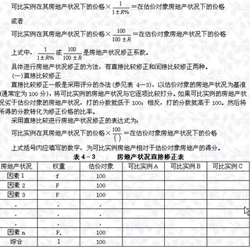 在百分率法中,房地產(chǎn)狀況修正系數(shù)應(yīng)以估價(jià)對(duì)象的房地產(chǎn)狀況為基準(zhǔn)來確定。假設(shè)可比實(shí)例在其房地產(chǎn)狀況下的價(jià)格比在估價(jià)對(duì)象房地產(chǎn)狀況下的價(jià)格高低的百分率為±R%(當(dāng)可比實(shí)例在其房地產(chǎn)狀況下的價(jià)格比在估價(jià)對(duì)象房地產(chǎn)狀況下的價(jià)格高時(shí),為+R%;低時(shí),為-R%),則