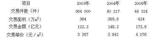 ××房地產市場近幾年一直保持了良好的發展趨勢,盡管國家以及地方從2005年開始不斷加大對房地產市場的宏觀調控,但該市房地產市場總體上一直保持了較快的上漲趨勢。近三年來××市房地產交易相關數據匯總見下表:
