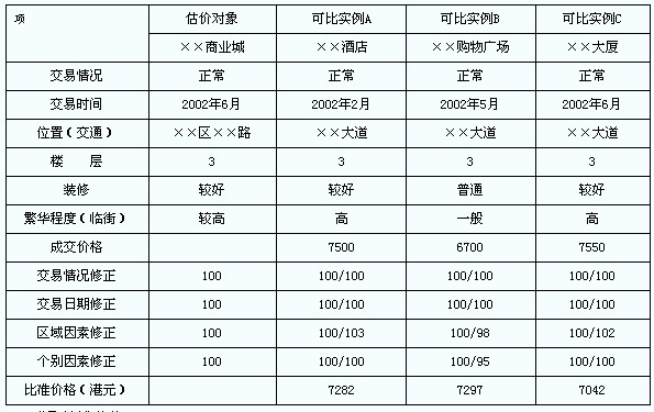 有關統計部門的資料表明,2002年房地產的市場價格略有下降,但下調幅度較大的是高檔寫字樓和住宅。上述三個可比實例均為商業用途,該類物業2002年交易價格比較平穩,且交易日期比較接近,故不進行交易修正。