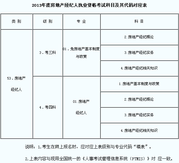 2013年度廣東房地產估價師執業資格考試科目及其代碼對應表