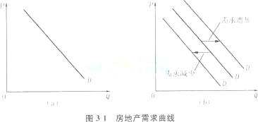 房地產需求曲線表示房地產的需求量與其價格之間的關系--某種房地產的需求量如何隨著該種房地產價格的變動而變動。在圖3-1(a)中,根據習慣,以縱坐標軸表示某種房地產的價格(P),橫坐標軸表示該種房地產的需求量(Q),因為在房地產價格較高時房地產的需求量減少,在房地產價格較低時房地產的需求量增加,所以得到的是一條向右下方傾斜的房地產需求曲線(D)。