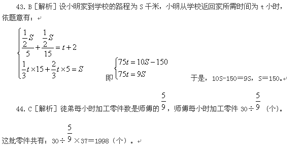 46. B[解析]張強加工160個零件時,王充加工200-48=152(個)零件,因此當張強加工200個零件時,王充加工200/160×152=190(個)零件,還有200-190=10(個)零件沒有加工。