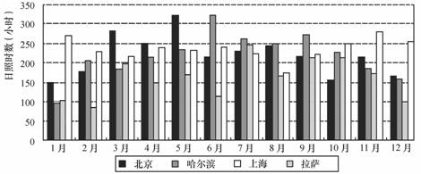 A.拉薩日照最高月份的日照時(shí)數(shù)少于哈爾濱最高月份的日照時(shí)數(shù)