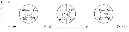 (二)每題圖形中的數字都包含一定的規律,請你總結前兩個圖形中數字的規律,從四個選項中選出你認為問號應該代表的數字。