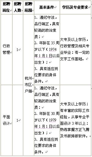 杭州市市級機關文印中心是中共杭州市委辦公廳所屬的非財政補助事業單位。因工作需要,公開招聘工作人2名。依據杭州市人事局《關于貫徹落實國家人事部<事業單位公開招聘人員暫行規定>的實施辦法》(杭人政[2006]5號),現將有關事項公告如下: