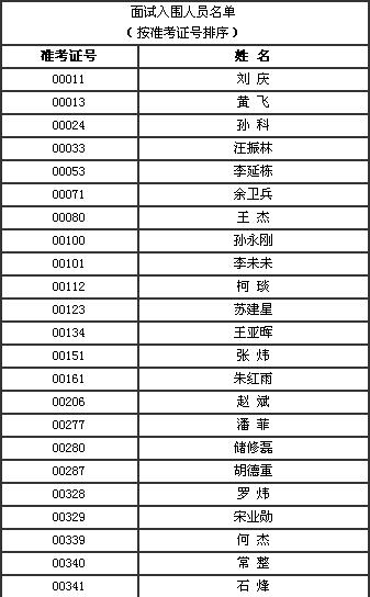 根據筆試成績,現將面試入圍人員名單予以公布(附后)。請入圍人員攜帶本人身份證、準考證,并提交紙介質個人自傳1份(要求內容真實,2500字左右,A4紙打印),于2009年3月22日(星期天)上午7:30前到省委大院內省委辦公廳服務樓裙樓六樓會議室(合肥市紅星路1號,九獅苑賓館對面)報到,抽簽后參加面試,時間一天,逾期不再補考。