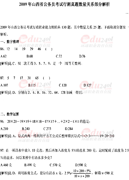 山西2009公務(wù)員考試行測數(shù)量關(guān)系真題及解析