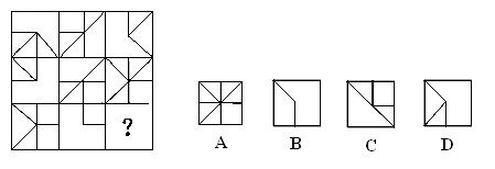 (解答:每行前兩個圖形疊加后,不同的部分就是第三個圖形。正確答案是D。)