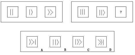 例題:下題給出兩套圖形,左套中的三個圖形在構成上,或變化上,具有某種特點或遵循某種規則。要求從下面四個選項中,選擇一個取代右套中的“?”,使右套圖形也具有與左套圖形相同或相似的構成特點或變化規則。