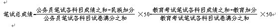 招錄機關按照筆試合格總成績(含照顧加分)從高分到低分按規定比例確定面試人選。筆試總成績的計算公式為: