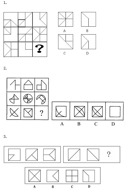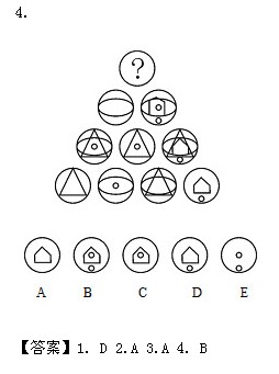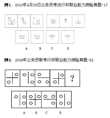 【解析】這兩題雖然形式不同,但有一點,圖形的組成很相似。相似圖形間是怎樣變化的?很容易發現,前兩個圖疊加,相同的部分消去,不同的部分保留,也就是去同存異。但2010年2010年4月25日公務員考試17題比2009年公務員聯考的52題更容易判斷推理路線,這兩題的答案都是A。