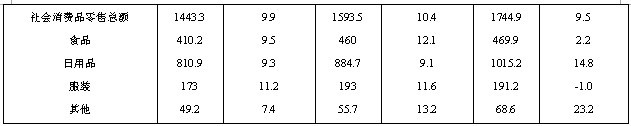 2005年,我國零售業延續了高速增長的勢頭,上半年共實現社會消費品零售總額2.96萬億元,同比增長13.2%。上半年,居民消費價格指數中食品類價格上漲4.4%,大大低于去年同期9.5%?的增長速度。食品類商品實現零售額103.8億元,同比增長27.1%。服裝類商品零售額增長略高于銷量增幅。服裝類商品實現零售額200.2億元,同比增長24.9%,各類服裝銷量為10018萬件,同比增長23.7%。汽車零售類銷售額同比增長9.3%。電器類商品在大型零售企業銷售中所占份額日趨減少。生活電器類商品零售額69.2億元,同比增長8.5%,占商品零售額的9.4%,遠遠低于服裝類和食品類商品所占份額。