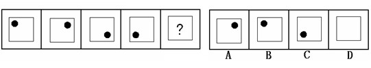 (答案:B。黑點在正方形中順時針移動。在第5個圖形中,應該正好移動到左上角。)