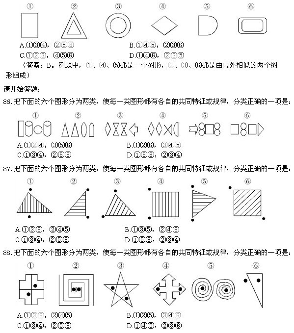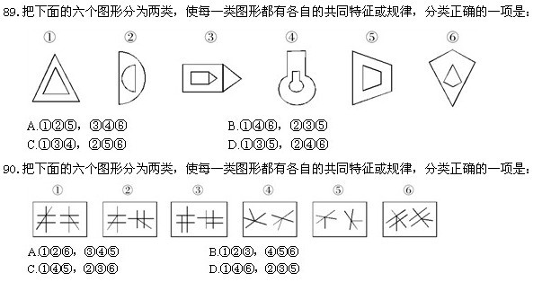 以下86-90題,每個題目包含六個圖形,請把此六個圖形分為兩類,使得每一類圖形都有各自的共同特征或規律。