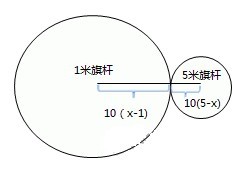 【老師作答】C。旗桿的高度最高為5,最小為1。因此這兩個旗桿間的距離不超過(5-1)×10=40米。考慮其余旗桿的位置分布,設任意旗桿高度為x。要滿足與1米旗桿間距離不超過它們高度差的10倍,應在下圖左邊的圓范圍內。要滿足與5米旗桿間距離不超過它們高度差的10倍,應在下圖右邊的圓范圍內。同時滿足條件的旗桿只能位于兩個旗桿的連線上。所以滿足條件的旗桿都位于一條直線上,最少需要40×2=80米即可把它們都圍進去。