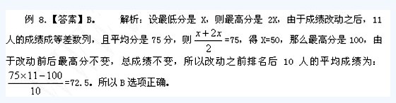 例8.某次對11名同學進行成績排名,發現最高分恰好是最低分的兩倍,后來發現某道題判錯了,改過后,11人的成績恰好成等差數列,且最高分最低分成績不變,總成績不變,已知改過成績之后平均分是75分,問改成績之前,排名后10人的平均分是多少?