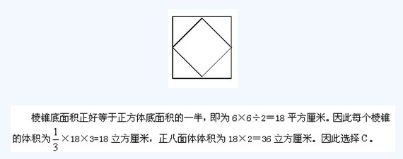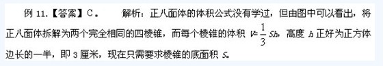 例11.連接正方體每個面的中心構成一個正八面體(如下圖所示)。已知正方體的邊長為6厘米,問正八面體的體積為多少立方厘米?【2012-國家公務員考試-80】