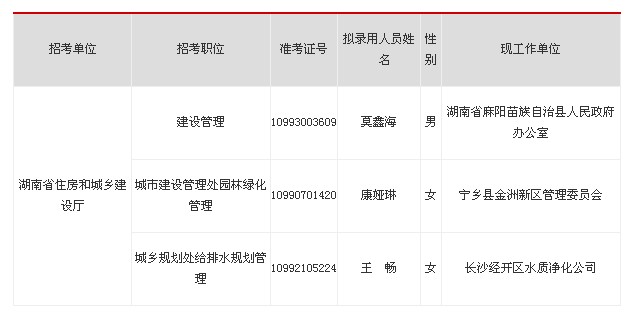 根據省委組織部、省人力資源和社會保障廳、省公務員局《湖南省2012年考試錄用公務員公告》的有關規定,經報名、資格審查、筆試、面試、體檢、考察等程序,確定2012年湖南省住房和城鄉建設廳考試錄用公務員擬錄用人員名單: