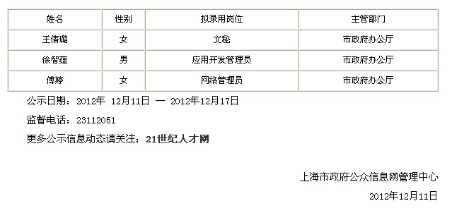 本單位根據《事業單位公開招聘人員暫時辦法》〔滬人社專發(2009)45號〕的要求,擬錄用以下人員,現將有關情況予以公示。公示期間,如有異議,請向本單位反映。