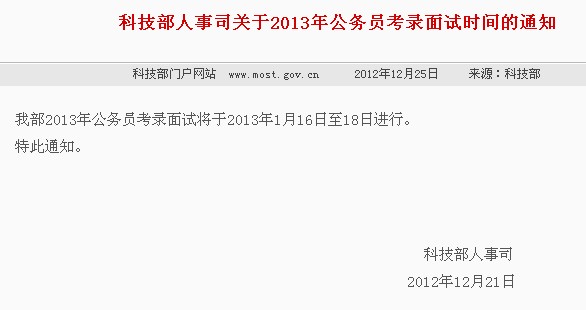 科技部2013國家公務員考試面試時間1月16日至18日