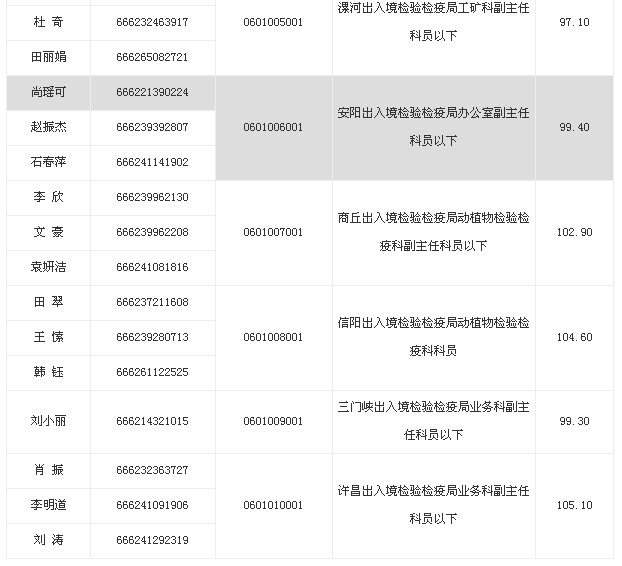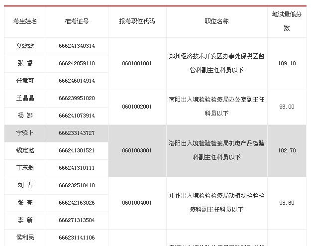 河南出入境檢驗檢疫局2013年度公務員考錄面試人員名單如下:
