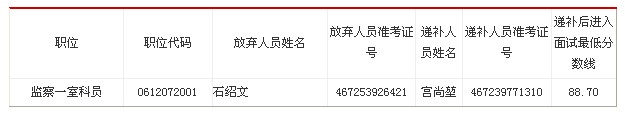 因部分進入面試名單人員自愿放棄面試資格,根據公務員考錄有關規定,擬進行遞補,現將考錄面試遞補人員名單公告如下: