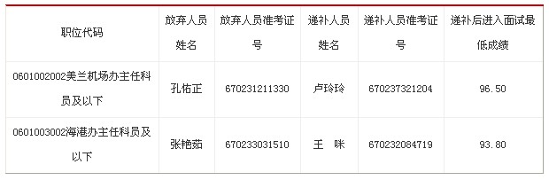 因部分進入面試考生放棄面試資格,根據有關規定,我局在報考該職位公共科目筆試成績合格的考生中,按照成績由高到低的順序進行遞補。遞補人選如下: