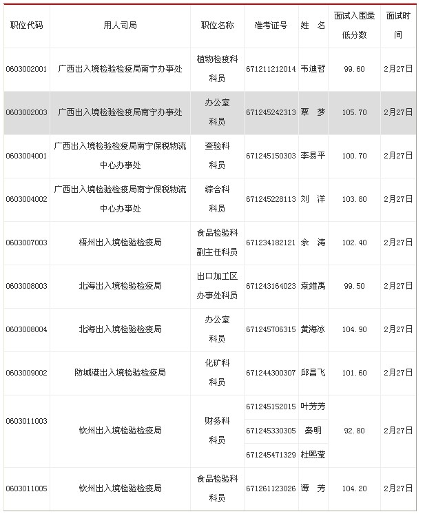 請上述考生按《廣西出入境檢驗檢疫局2013年度考試錄用公務員面試公告》的有關要求于2月26日參加面試資格復審,并發送電子郵件至wuk@gxciq.gov.cn進行面試確認。