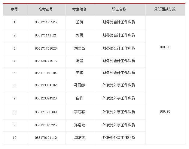 在公共科目筆試成績(jī)合格的考生中,按照每個(gè)職位筆試總成績(jī)從高到低的順序,共確定了10名面試對(duì)象。面試人員名單如下: