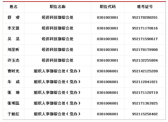 經(jīng)濟(jì)科技部綜合處職位最低面試分?jǐn)?shù)線為113.40分;組織人事部綜合處(黨辦)職位最低面試分?jǐn)?shù)線為116.00分。